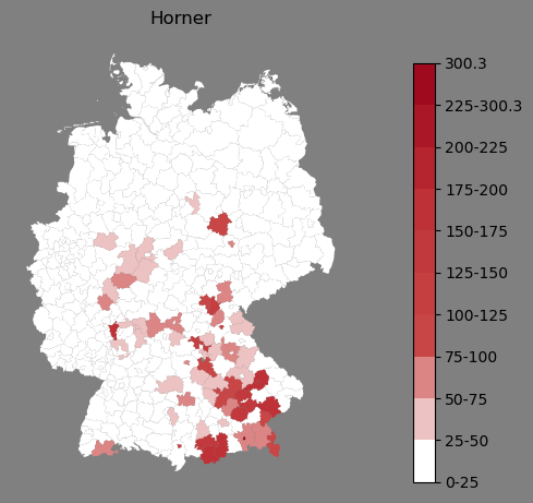 Relative Verteilung des Namens Horner (1996)Direkt zur Karte Die Farbskala zeigt die Anzahl von "Horner" bezogen auf je 1 Million Einträge. |