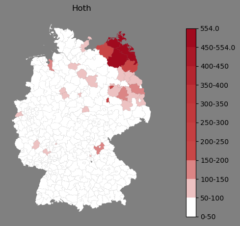 Relative Verteilung des Namens Hoth (1996)Direkt zur Karte Die Farbskala zeigt die Anzahl von "Hoth" bezogen auf je 1 Million Einträge. |