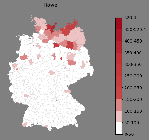 Absolute Verteilung des Namens Howe (1890)Direkt zur Karte Absolute Verteilung des Namens "Howe" um 1890 im damaligen Deutschen Reich Sie können die Karte innerhalb des Fensters zoomen und verschieben. |