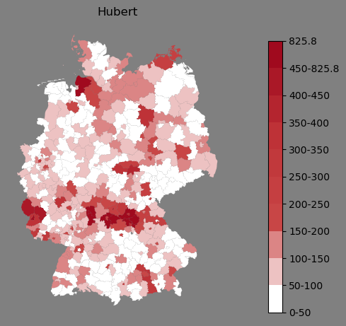 Absolute Verteilung des Namens Hubert (1890)Direkt zur Karte Absolute Verteilung des Namens "Hubert" um 1890 im damaligen Deutschen Reich Sie können die Karte innerhalb des Fensters zoomen und verschieben. |