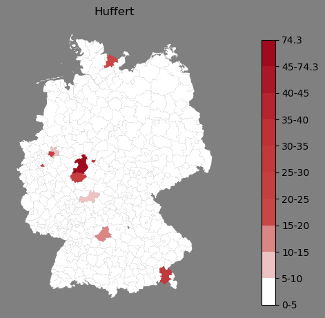 Relative Verteilung des Namens Huffert (1996)Direkt zur Karte Die Farbskala zeigt die Anzahl von "Huffert" bezogen auf je 1 Million Einträge. |