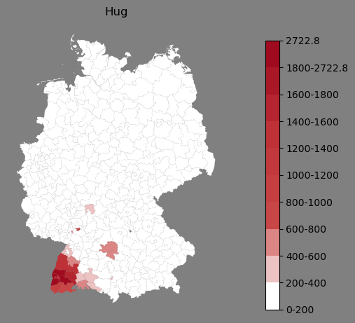 Relative Verteilung des Namens Hug (1996)Direkt zur Karte Die Farbskala zeigt die Anzahl von "Hug" bezogen auf je 1 Million Einträge. |