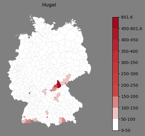 Relative Verteilung des Namens Hugel (1996)Direkt zur Karte Die Farbskala zeigt die Anzahl von "Hugel" bezogen auf je 1 Million Einträge. |