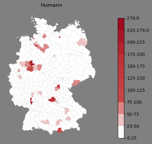 Absolute Verteilung des Namens Humann (1890)Direkt zur Karte Absolute Verteilung des Namens "Humann" um 1890 im damaligen Deutschen Reich Sie können die Karte innerhalb des Fensters zoomen und verschieben. |