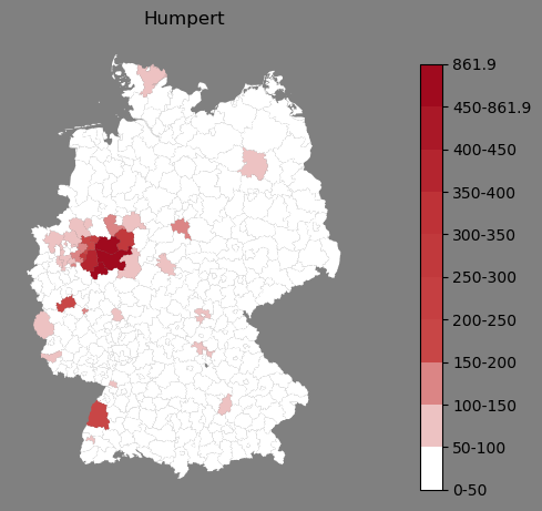 Relative Verteilung des Namens Humpert (1996)Direkt zur Karte Die Farbskala zeigt die Anzahl von "Humpert" bezogen auf je 1 Million Einträge. |