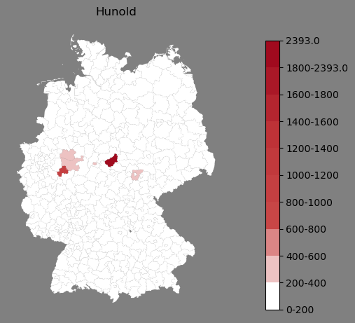 Relative Verteilung des Namens Hunold (1996)Direkt zur Karte Die Farbskala zeigt die Anzahl von "Hunold" bezogen auf je 1 Million Einträge. |
