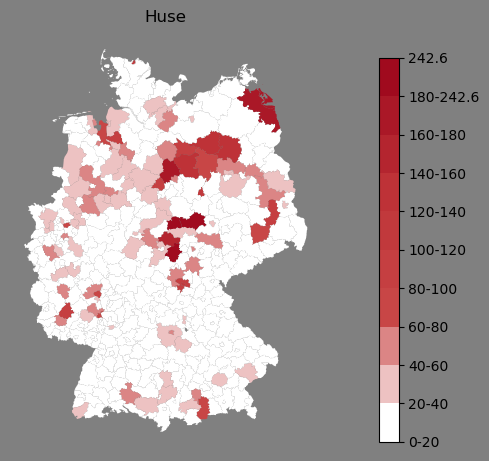 Relative Verteilung des Namens Huse (1996)Direkt zur Karte Die Farbskala zeigt die Anzahl von "Huse" bezogen auf je 1 Million Einträge. |