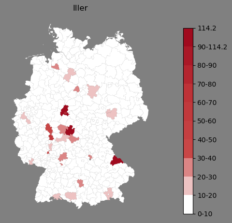 Relative Verteilung des Namens Iller (1996)Direkt zur Karte Die Farbskala zeigt die Anzahl von "Iller" bezogen auf je 1 Million Einträge. |