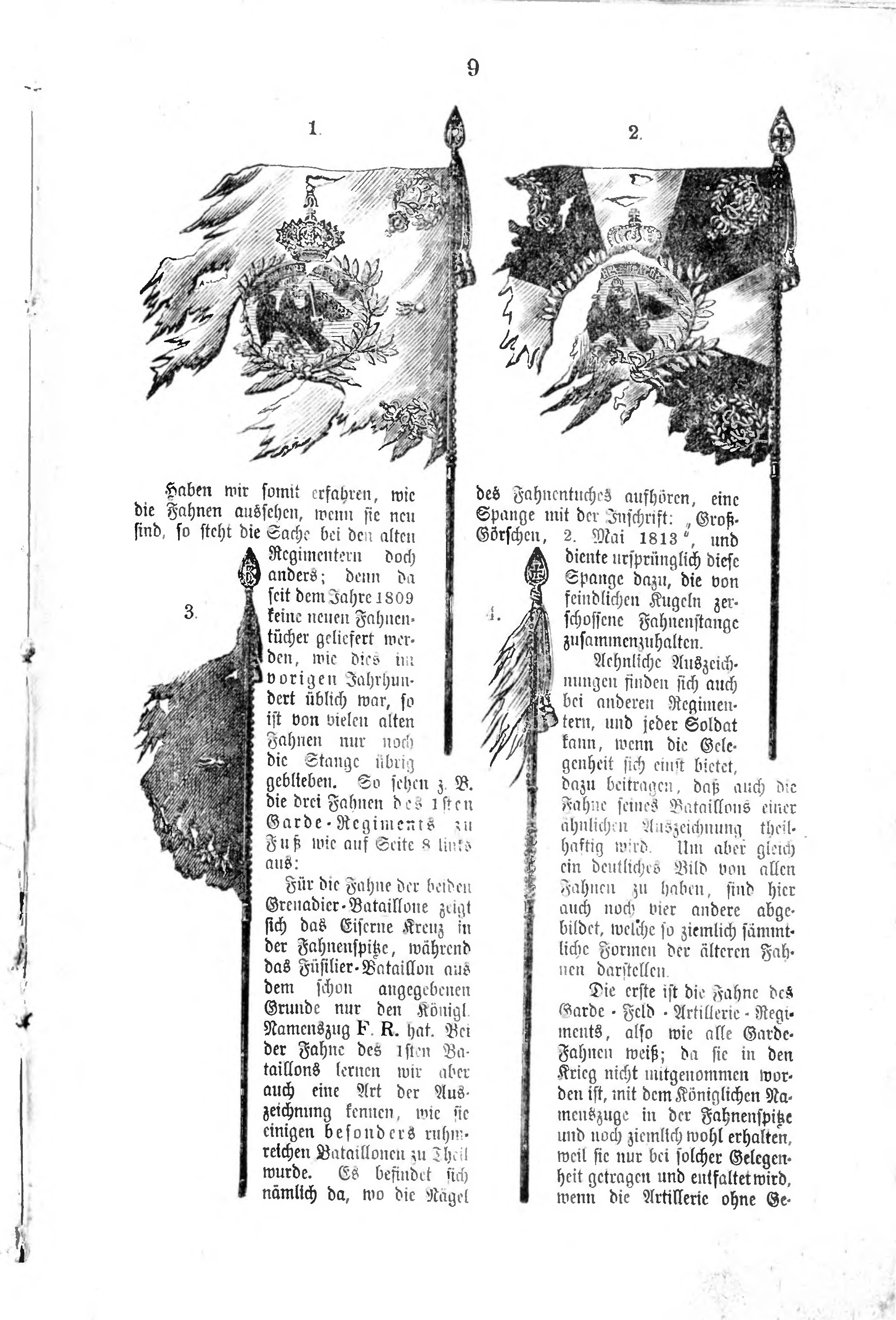 Haben wir somit erfahren, wie die Fahnen aussehen, wenn sie neu sind, so steht die Sache bei den alten Regimentern doch anders; denn da seit dem Jahre 1809 keine neuen Fahnentücher geliefert werden, wie dies im vorigen Jahrhundert üblich war, so ist von vielen alten Fahnen nur noch die Stange übrig geblieben. So sehen z. B. die drei Fahnen des 1sten Garde-Regiments zu Fuß wie auf Seite 8 links aus.