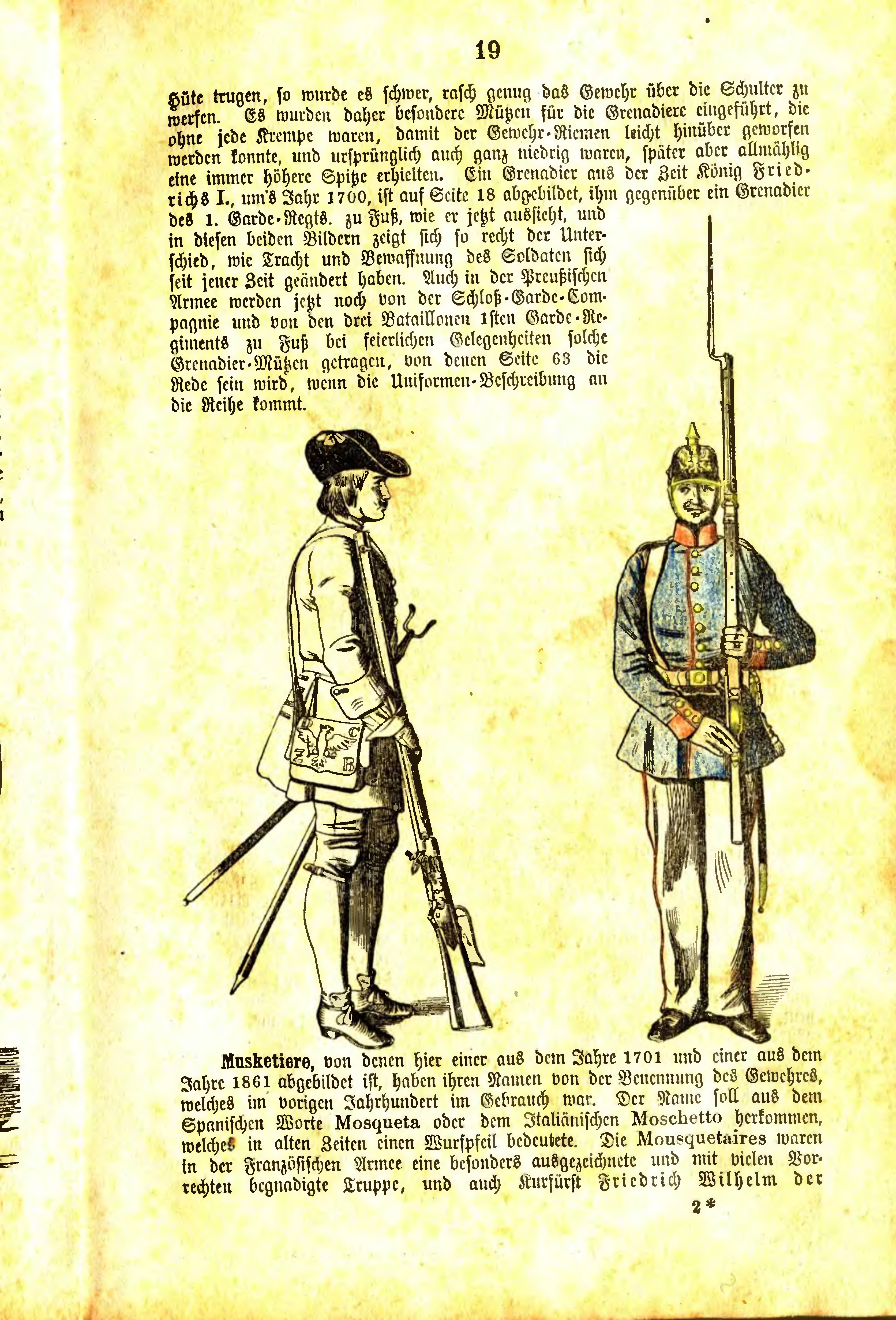 {{NE]]Musketiere, von denen hier einer aus dem Jahre 1701 und einer aus dem Jahre 1861 abgebildet ist, haben ihren Namen von der Benennung des Gewehrsm welches im vorigen Jahrhundert im Gebrauch war. Der Name soll aus dem Spanischen Worte Mosqueta oder dem Italiänischen Moschetto herkommen, welches in alten Zeiten einen Wurfpfeil bedeutete. Die Mousquetaires waren in der Französischen Armee eine besonders ausgezeichnete und mit vielen Vorrechten begnadigte Truppe, und auch Kurfürst Friedrich Wilhelm der