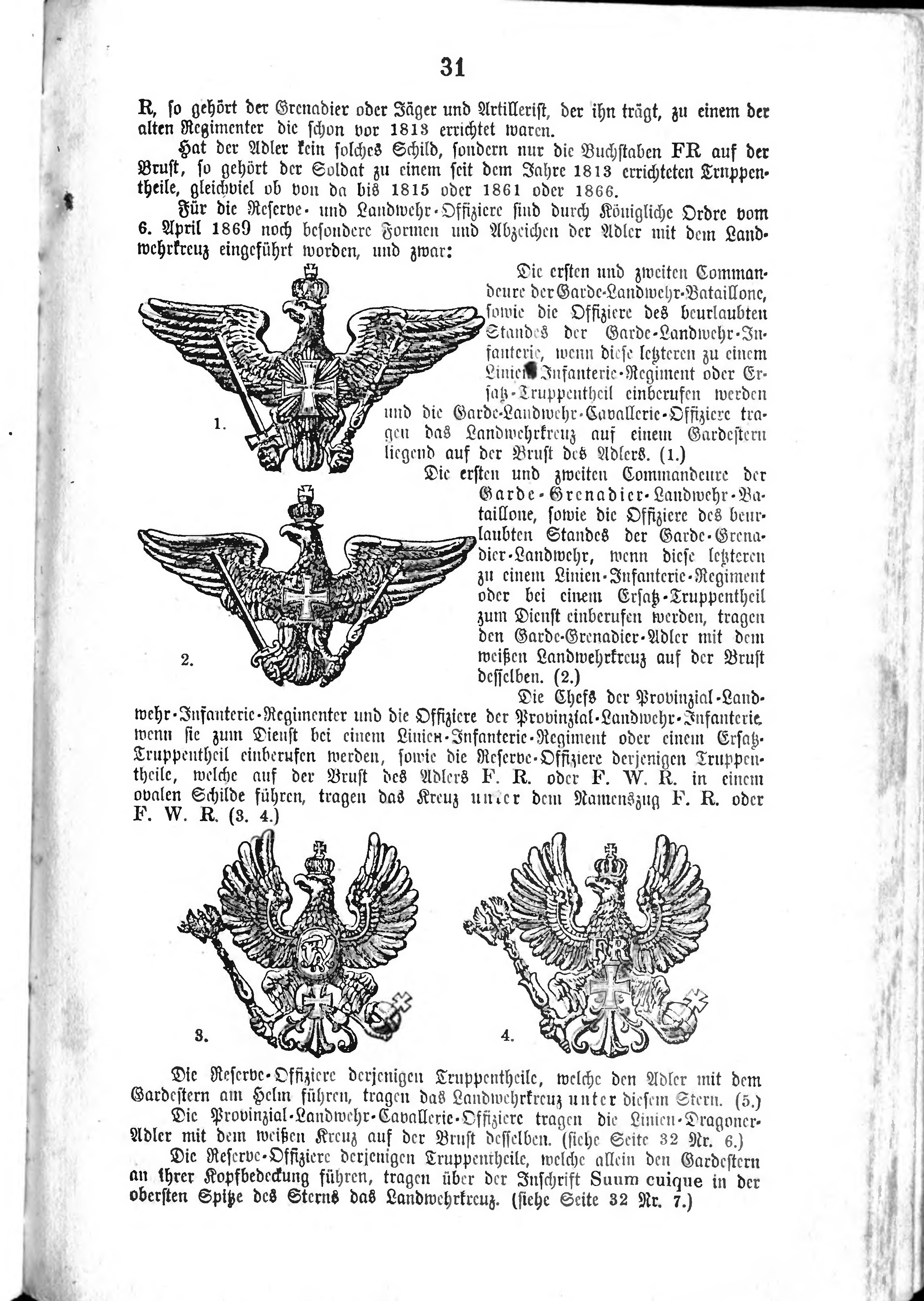 Für die Reserve- und Landwehr-Offiziere sind durch Königliche Ordre vom 6. April 1869 noch besondere Formen und Abzeichen der Adler mit dem Landwehrkreuz eingeführt worden, und zwar: