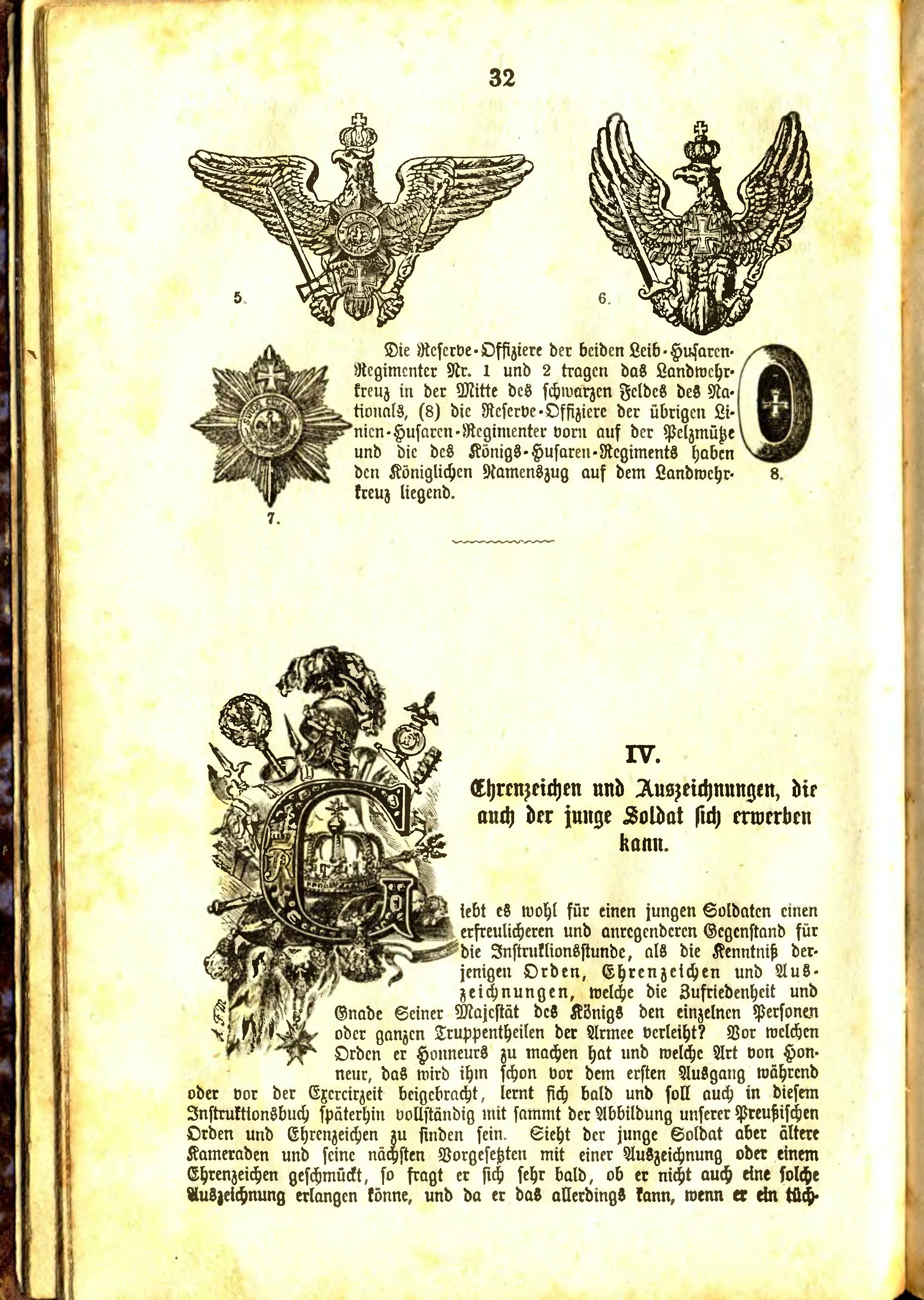 Versalie:G Giebt es wohl für einen jungen Soldaten einen erfreulicheren und anregenderen Gegenstand für die Instruktionsstunde, als die Kenntniß derjenigen Orden, Ehrenzeichen und Auszeichnungen, welche die Zufriedenheit und Gnade Seiner Majestät des Königs den einzelnen Personen oder ganzen Truppentheilen der Armee verleiht? Vor welchen Orden er Honneurs zu machen hat und welche Art von Honneur, das wird ihm schon vor dem ersten Ausgang während oder vor der Exercirzeit beigebracht, lernt sich bald und soll auch in diesem Instruktionsbuch späterhin vollständig mit sammt der Abbildung unerer Preußischen Orden und Ehrenzeichen zu finden sein. Sieht der junge Soldat aber ältere Kameraden und seine nächsten Vorgesetzten mit einer Auszeichnung oder einem Ehrenzeichen geschmückt, so fragt er sich sehr bald, ob er nicht auch eine solche Auszeichnung erlangen könne, und da er das allerdings kann, wenn er ein tüchtiger