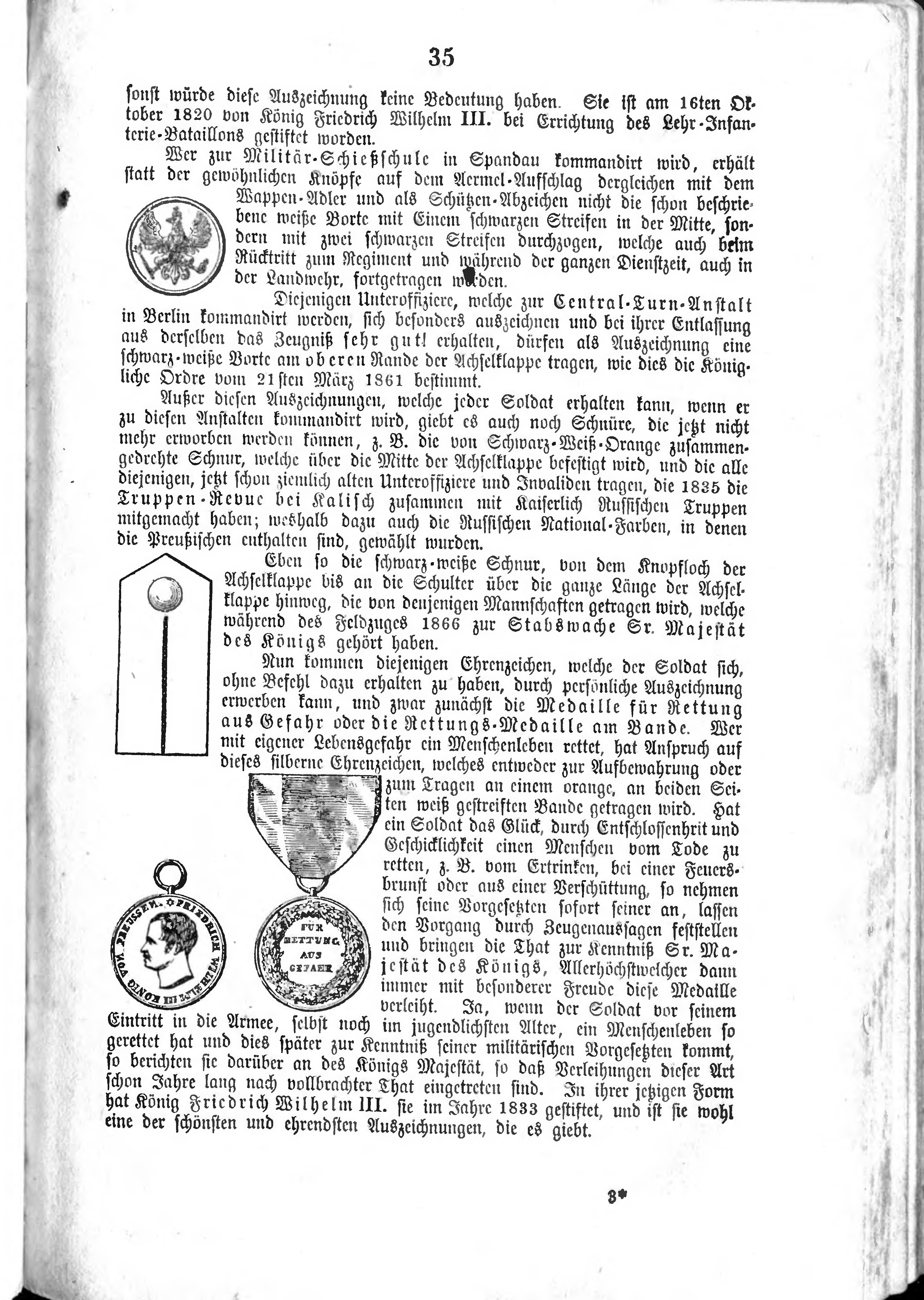 Hat ein Soldat das Glück, durch Entschlossenheit und Geschicklichkeit einen Menschen vom Tode zu retten, z. B. vom Ertrinken, bei einer Feuersbrunst oder aus einer Verschüttung, so nehmen sich seine Vorgesetzten sofort seiner an, lassen den Vorgang durch Zeugenaussagen feststellen und bringen die That zur Kenntniß Sr. Majestät des Königs. Allerhöchstwelcher dann immer mit besonderer Freude diese Medaille verleiht. Ja, wenn der Soldat vor seinem Eintritt in die Armee, selbst noch im jugendlichen Alter, ein Meschenleben gerettet hat und dies später zur Kenntniß seiner militärischen Vorgesetzten kommt, so berichten sie darüber an des Königs Majestät, so daß Verleihungen dieser Art schon Jahre lang nach vollbrachter That eingetreten sind. In ihrer jetzigen Form hat König Friedrich Wilhelm III. sie im Jahre 1833 gestiftet, und ist sie wohl eine der schönsten und ehrendsten Auszeichnungen, die es giebt.