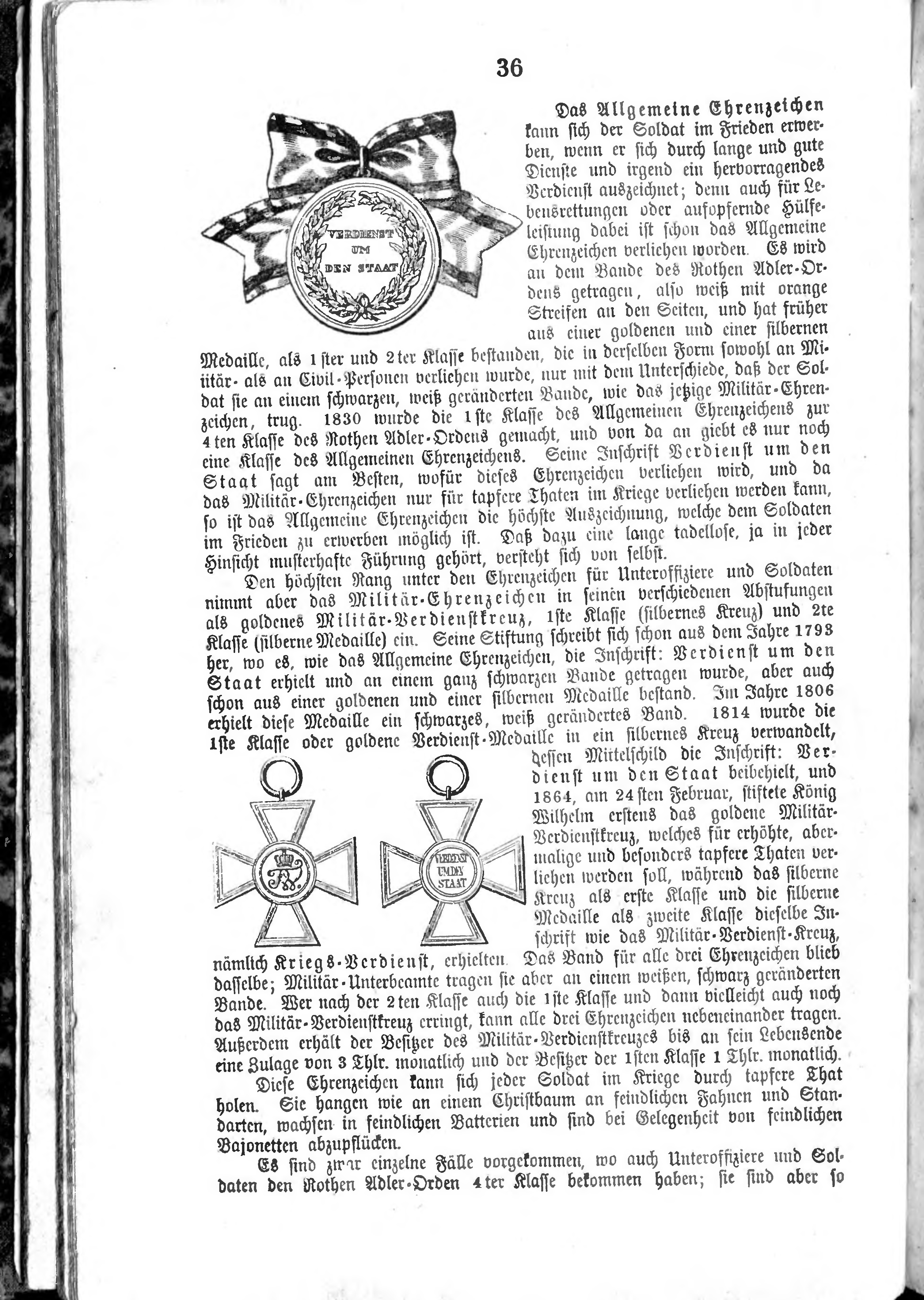 Das Allgemeine Ehrenzeichen kann sich der Soldat im Frieden erwerben, wenn er sich durch lange und gute Dienste und irgend ein hervorragendes Verdienst auszeichnet; denn auch für Lebensrettungen oder aufopfernde Hülfeleistung dabei ist schon das Allgemeine Ehrenzeichen verliehen worden. Es wird an dem Bandes des Rothen Adler-Ordens getragen, also weiß mit Orange Streifen an den Seiten, und hat früher aus einer goldenen und einer silbernen Medaille, als 1ste und 2te Klasse, bestanden, die in derselben Form sowohl an Militär- als an Civil-Personen verliehen wurde, nur mit dem Unterschiede, daß der Soldat sie an einem schwarzen, weiß geränderten Bande, wie das jetzige Militär-Ehrenzeichem trug. 1830 wurde die 1ste Klasse des Allgemeinen Ehrenzeichens zur 4ten Klasse des Rothen Adler-Ordens gemacht, und von da an giebt es nur noch eine Klasse des Allgemeinen Ehrenzeichens. Seine Inschrift Verdienst um den Staat sagt am Besten, wofür dieses Ehrenzeichen verliehen wird, und da das Militär-Ehrenzeichen nur für tapfere Thaten im Kriege verliehen werden kann, so ist das Allgemeine Ehrenzeichen die höchste Auszeichnung, welche dem Soldaten im Frieden zu erwerben möglich ist. Daß dazu eine lange tadellose, ja in jeder Hinsicht musterhafte Führung gehört, versteht sich von selbst.