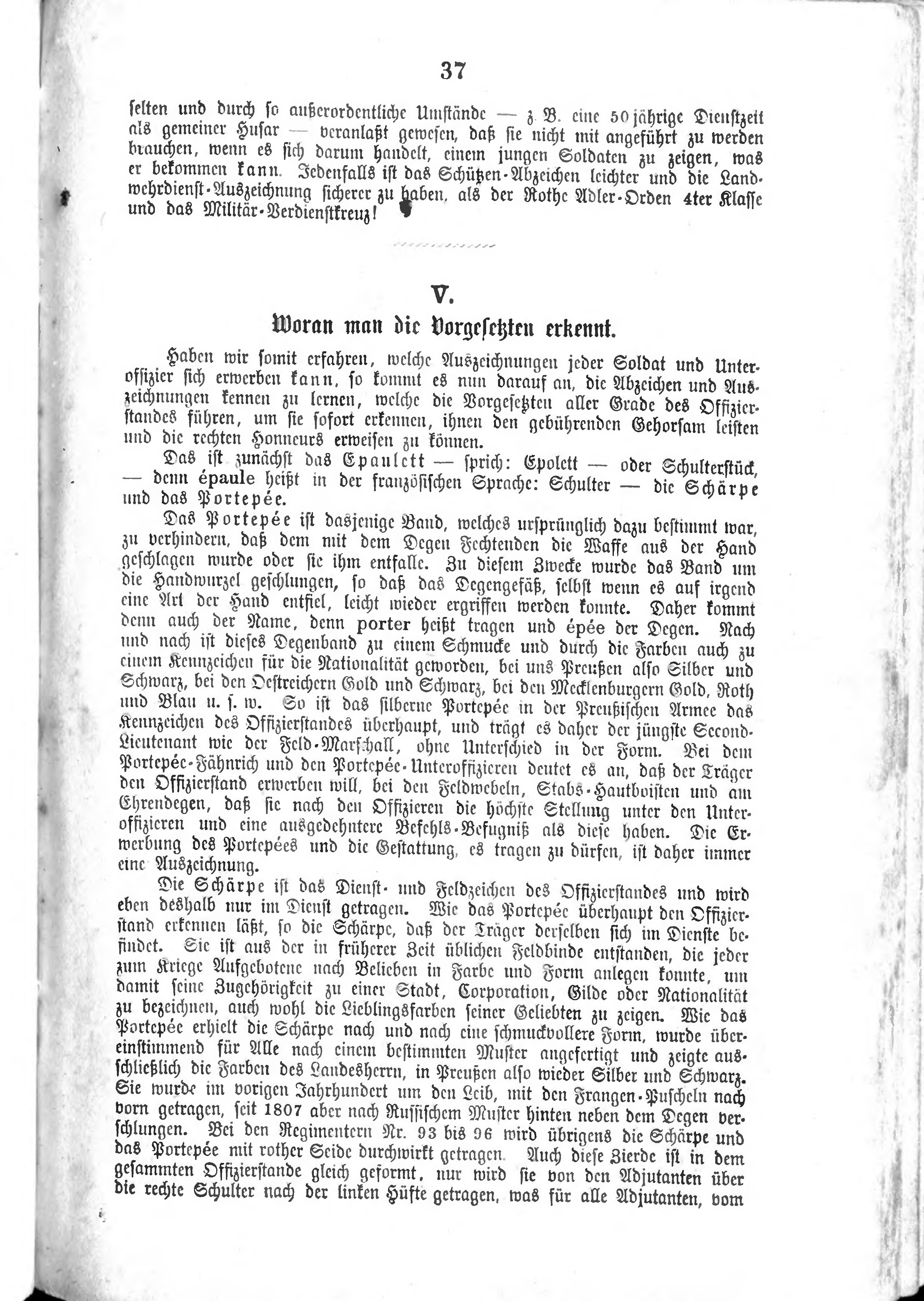 Das Portepée ist dasjenige Band, welches ursprünglich dazu bestimmt war, zu verhindern, daß dem mit dem Degen Fechtenden die Waffe aus der Hand geschlagen wurde oder sie ihm entfalle. Zu diesem Zwecke wurde das Band um die Handwurzel geschlungen, so daß das Degengefäß, selbst wenn es auf irgend eine Art der Hand emtfiel, leicht wieder ergriffen werden konnte. Daher kommt denn auch der Name, denn porter heißt tragen und épée der Degen. Nach und nach ist dieses Degenband zu einem Schmucke und durch die Farben auch zu einem Kennzeichen für die Nationalität geworden, bei uns Preußen also Silber und Schwarz, bei den Oesterreichern Gold und Schwarz, bei den Mecklenburgern Gold, Roth und Blau u. s. w.. So ist das silberne Portepée in der Preußischen Armee das Kennzeichen des Offizierstandes überhaupt, und trägt es daher der jüngste Second-Lieutnant wie der Feld-Marschall, ohne Unterschied in der Form. Bei dem Portepée-Fähnrich und dem Portepée-Unteroffizieren deutet es an, daß der Träger den Offizierstand erwerben will, bei den Feldwebeln, Stabs-Hautboisten und am Ehrendegen, daß sie nach den Offizieren die höchste Stellung unter den Unteroffizieren und eine ausgedehntere Befehls-Befugniß als diese haben. Die Erwerbung des Portepées und die Gestattung, es tragen zu dürfen, ist daher immer eine Auszeichnung.