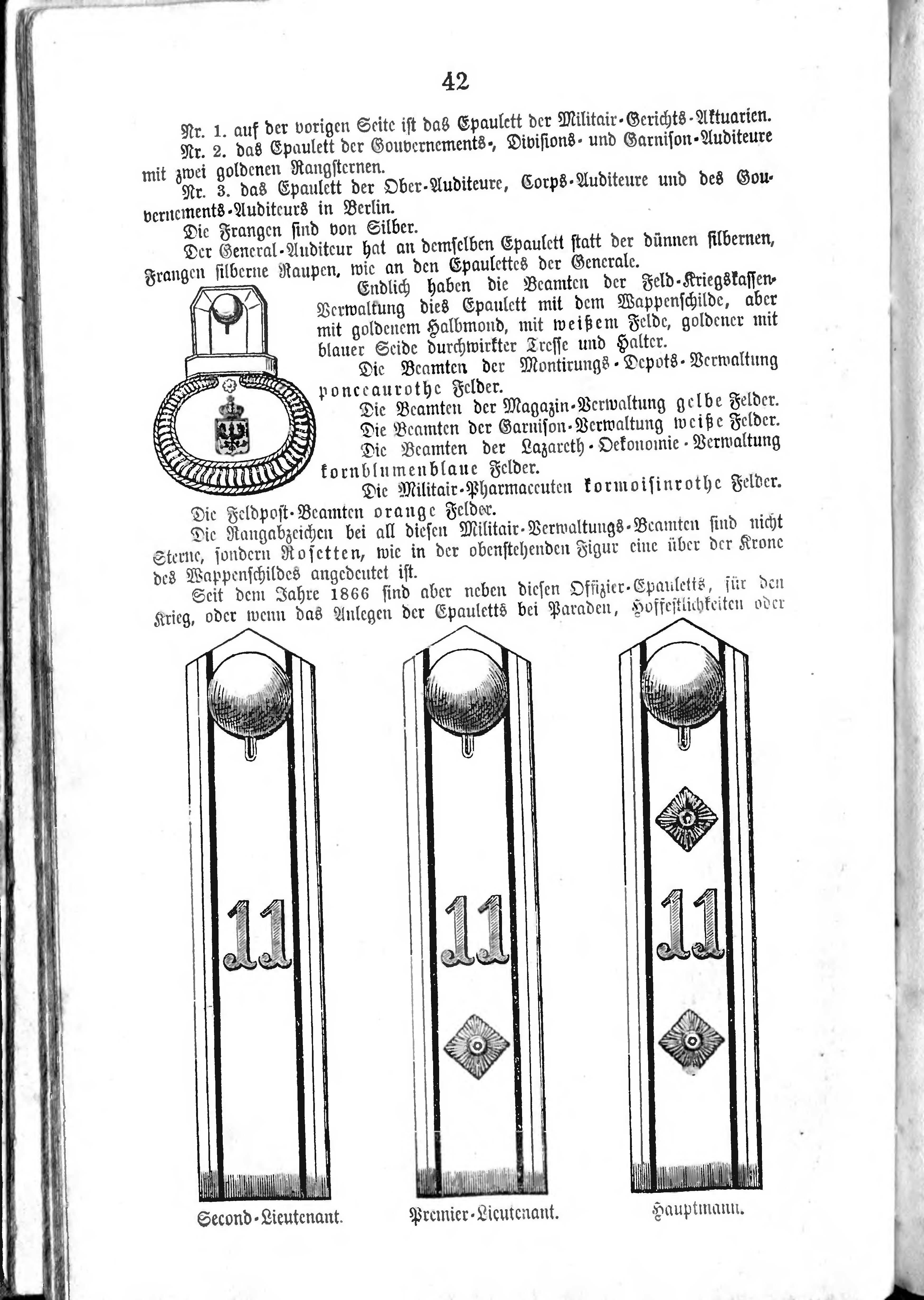 Seit dem Jahre 1866 sind aber neben diesen Offizier-Epauletts, für den Krieg, oder wenn das Anlegen der Epauletts bei Paraden Hoffestlicheiten oder