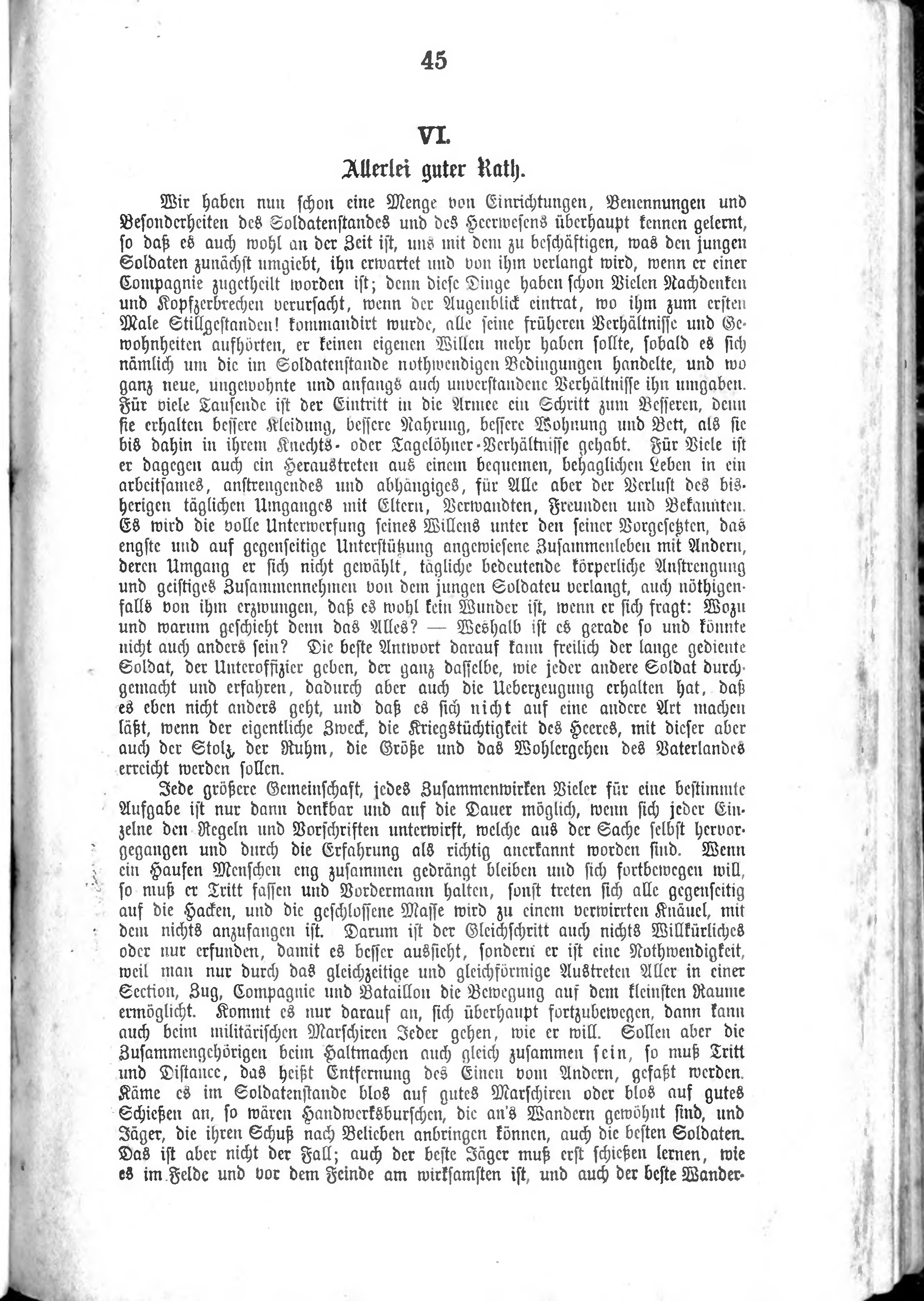 Wir haben nun schon eine Menge von Einrichtungen, Benennungen und Besonderheiten des Soldatenstandes und des Herrwesens überhaupt kennen gelent, so daß es auch wohl an der Zeit ist, uns mit dem zu beschäftigen, was den jungen Soldaten zunächst umgiebt, ihn erwartet und von ihm verlangt wird, wenn er einer Compagnie zugetheilt worden ist; denn diese Dinge haben schon Vielen Nachdenken und Kopfzerbrechen verursacht, wenn der Augenblick eintrat, wo ihm zum ersten Male Stillgestanden! kommandiert wurde, als seine früheren Verhältnisse und Gewohnheiten aufhörten, er keinen eigenen Willen mehr haben sollte, sobald es sich nämlich un die im Soldatenstande nothwendigen Bedingungen handelte, und wo ganz neue, ungewohnte und anfangs auch unverstandene Verhältnisse ihn umgaben. Für viele Tausende ist der Eintritt in die Armee ein Schritt zum Besseren, denn sie erhalten bessere Kleidung, bessere Nahrung, bessere Wohnung und Bett, als sie bis dahiin in ihrem Knechts- oder Tagelöhner-Verhältnisse gehabt. Für Viele ist er dagegen auch ein Heraustreten aus einem bequemen, behaglichen Leben in ein arbeitsames, anstrengendes und abhängiges, für Alle aber der Verlust des bisherigen täglichen Umganges mit Eltern, Verwandten, Freunden und Bekannten, Es wird die volle Unterwerfung seines Willens unter den seiner Vorgesetzten, das engste und auf gegenseitige Unterstützung angewiesene Zusammenleben mit Andern, deren Umgang er sich nicht gewählt, tägliche bedeutende körperliche Anstrengung und geistiges Zusammennehmen von den jungen Soldaten verlangt, auch nöthigenfalls von ihm erzwungen, daß es wohl kein Wunder ist, wenn er sich fragt: Wozu und warum geschieht denn das Alles? -- Weshalb ist es gerade so und könnte nicht auch anders sein? Die beste Antwort darauf kann freilich der lange gediente Soldat, der Unteroffizier geben, der ganz dasselbe, wie jeder andere Soldat durchgemacht und erfahren, dadurch aber auch die Ueberzeugung erhalten hat, daß es eben nicht anders geht, und daß es sich nicht auf eine andere Art machen läßt, wenn der eigentliche Zweck, die Kriegstüchtigkeit des Heeres, mit dieser aber auch der Stolz, der Ruhm, die Größe und das Wohlergehen des Vaterlandes erreicht werden sollen.