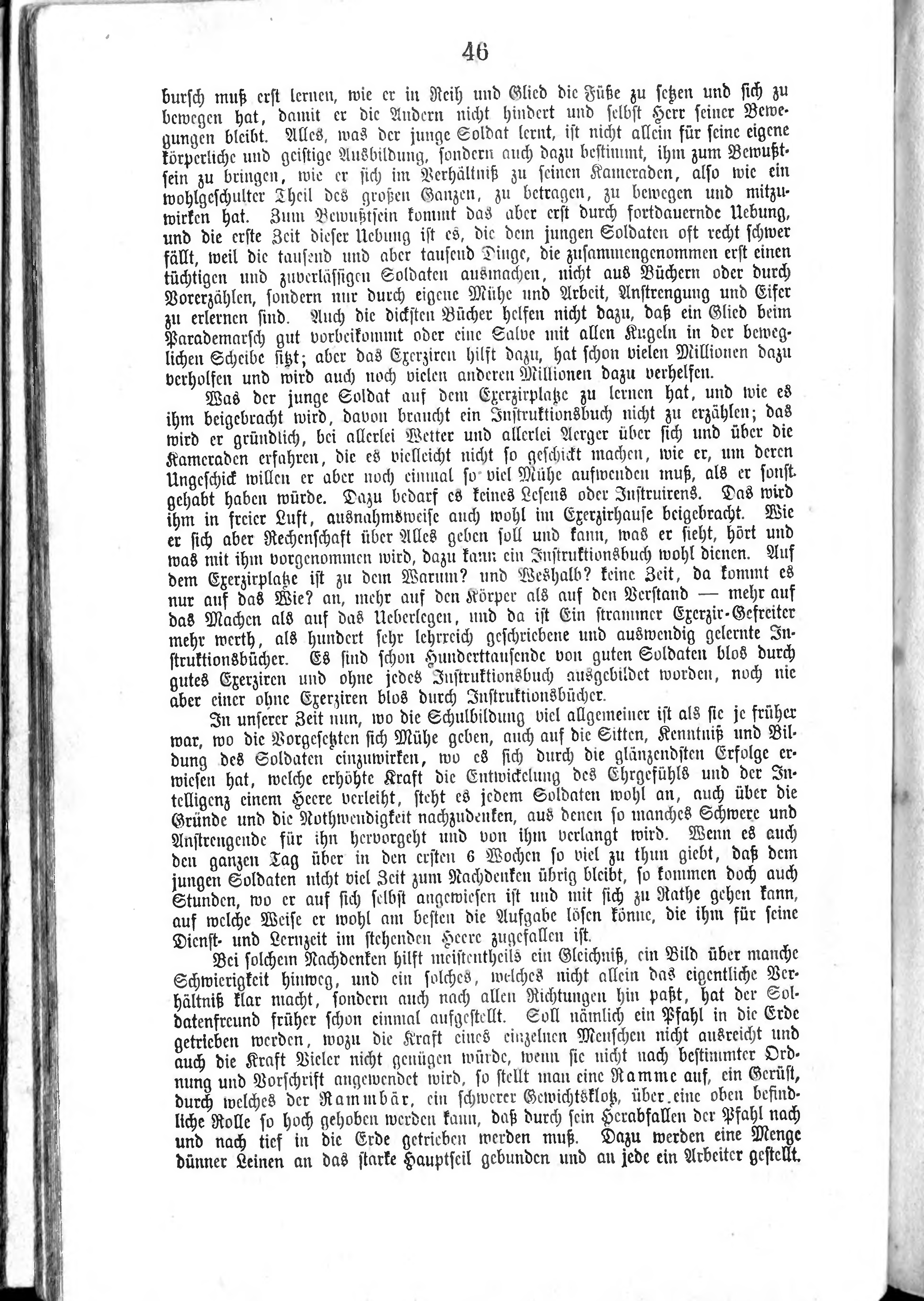 In unserer Zeit nun, wo die Schulbildung viel allgemeiner ist als sie früher war, wo die Vorgesetzten sich Mühe geben, auch auf die Sitten, Kenntniß und Bildung des Soldaten einzuwirken, wo es sich durch die glänzendsten Erfolge erwiesen hat, welche erhöhte Kraft die Entwicklung des Ehrgefühls und der Intelligenz einem Heere verleiht, steht es jedem Soldaten wohl an, auch über die Gründe und die Nothwendigkeit nachzudenken, aus denen so manches Schwere und Anstrengende für ihn hervorgeht und von ihm verlangt wird. Wenn es auch den ganzen Tag über in den ersten 6 Wochen so viel zu thun giebt, daß dem jungen Soldaten nicht viel Zeit zum Nachdenken übrig bleibt, so kommen doch auch Stunden, wo er auf sich selbst angewiesen ist und mit sich zu Rathe gehen kann, auf welche Weise er wohl am besten die Aufgabe lösen könne, die ihm für seine Dienst- und Lernzeit im stehenden Heere zugefallen ist.
