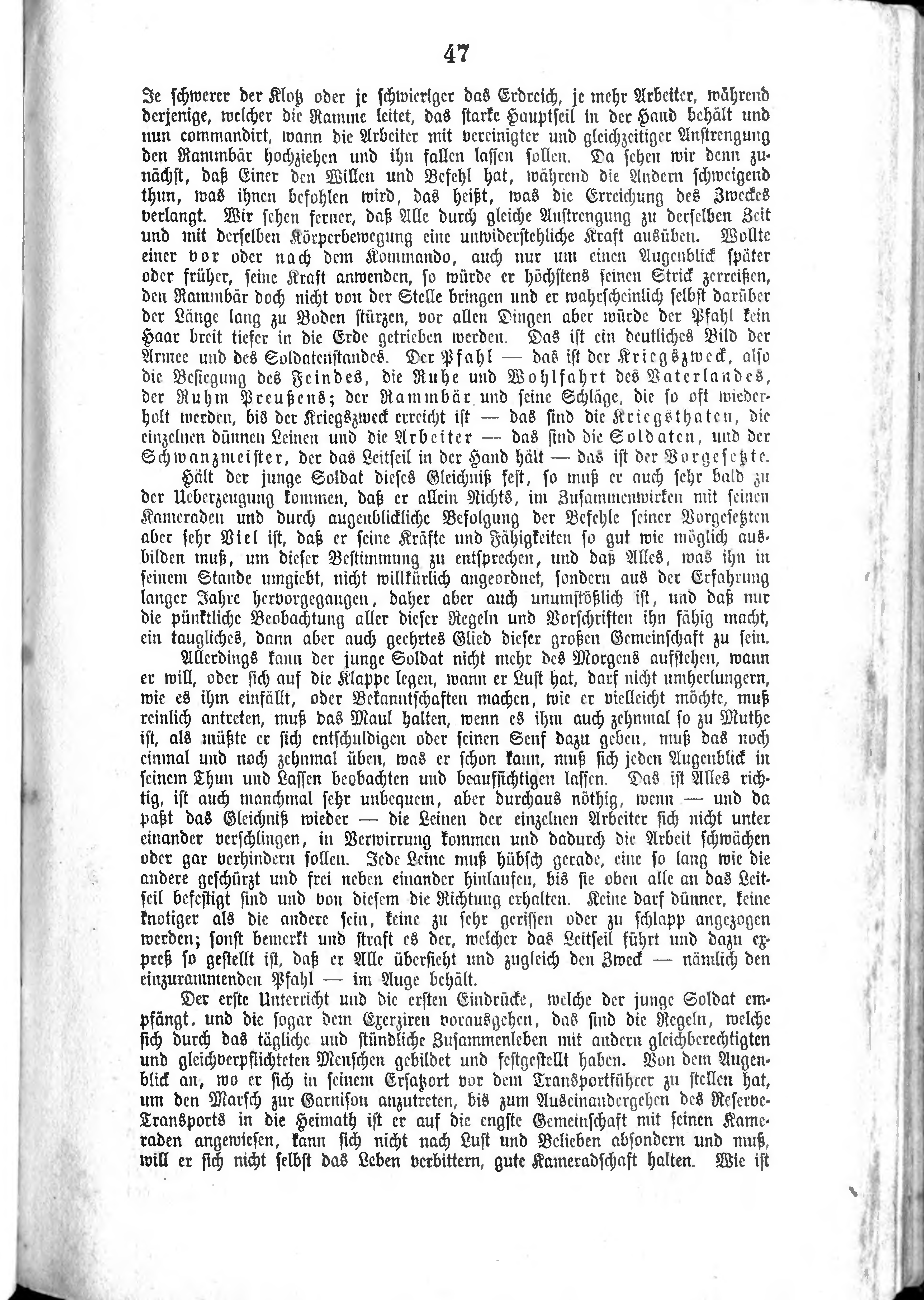Je schwerer der Klotz oder je schwieriger dea Erdreich, je mehr Arbeiter, während derjenige, welcher die Ramme leitet, das starke Hauptseil in der Hand behält und nun commandiert, wann die Arbeiter mit vereinigter und gleichzeitiger Anstrengung den Rammbär hochziehen und ihn fallen lassen sollen. Da sehen wir denn zunächst, daß Einer den Willen und Befehl hat, während die Andern schweigend thun was ihnen befohlen wird, das heißt, was die Erreichung des Zweckes verlangt. Wir sehen ferner, daß Alle durch gleiche Anstrengung zu derselben Zeit und mit derselben Körperbewegung eine unwiderstehliche Kraft ausüben. Wollte einer vor oder nach dem Kommansdo, auch nur um einen Augenblick später oder früher, seine Kraft anwenden, so würde er höchstens seinen Strick zerreißen, den Rammbär doch nicht von der Stelle bringen und er selbst darüber der Länge lang zu Boden stürzen, vor allen Dingen aber würde der Pfahl kein Haar breit tiefer in die Erde getrieben werden. Das ist ein deutliches Bild der Armee und des Soldatenstandes. Der Pfahl -- das ist der Kriegszweck, also die Besiegung des Feindes, die Ruhe und Wohlfahrt des Vaterlandes, der Ruhm Preußens; der 'Rammbär und seine Schläge, die so oft wiederholt werden, bis der Kriegszweck erreicht ist -- das sind die Kriegsthaten, die einzelnen dünnen Leinen und die Arbeiter -- das sind die Soldaten, und der Schwanzmeister, der das Leitseil in der Hand hält -- das ist der Vorgesetzte.