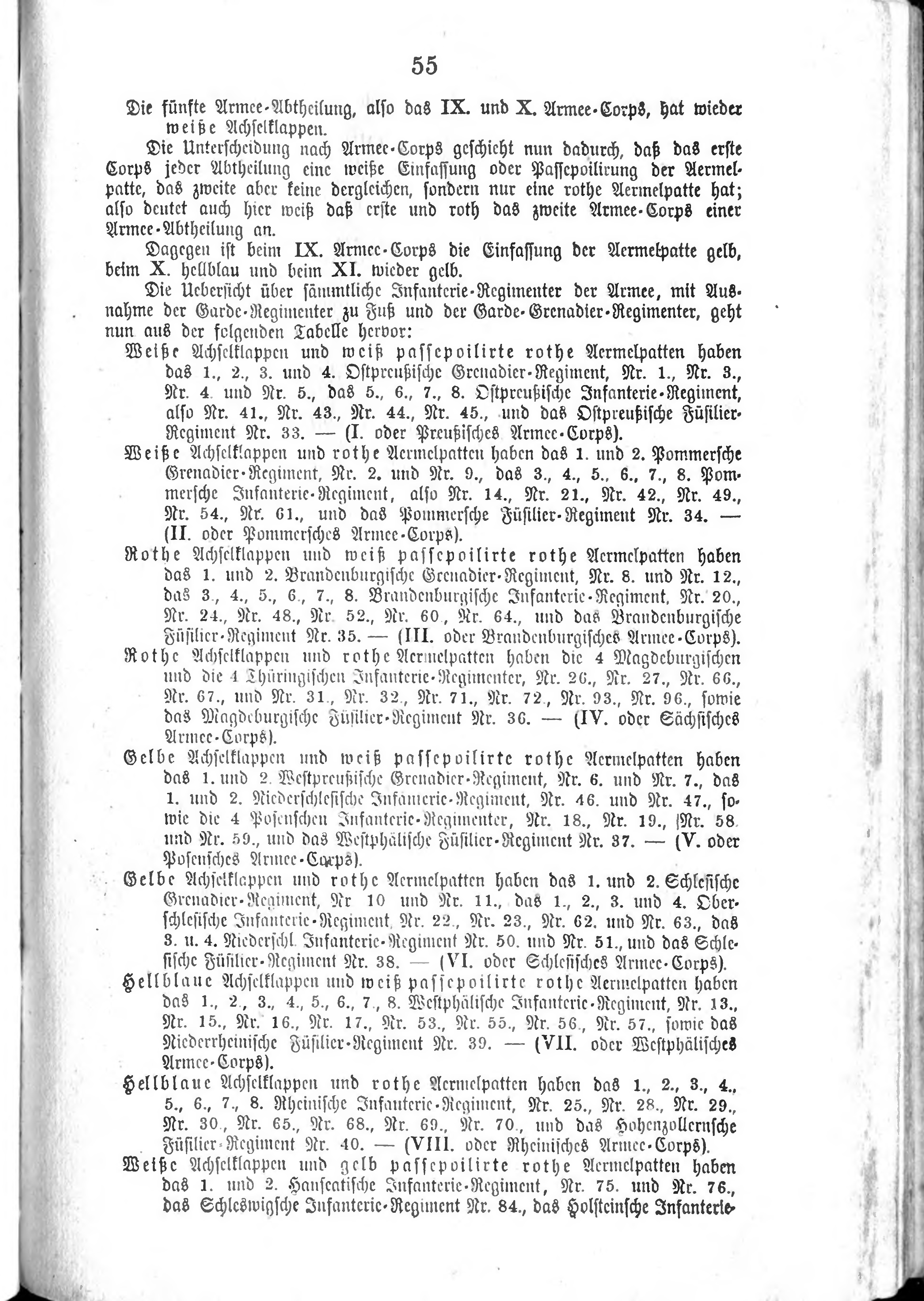 Weiße Achselklappen und weiß passepoilierte rothe Aermelpatten haben das 1., 2., 3. und 4. Ostpreußische Grenadier-Regiment Nr. 1., Nr. 3., Nr. 4. und Nr. 5., das 5., 6., 7., 8. Ostpreußische Infanterie-Regiment, also Nr. 41., Nr. 43., Nr. 44., Nr. 45., und das Ostpreußische Füsilier-Regimsnt Nr. 33. -- (I. oder Preußisches Armee-Corps).