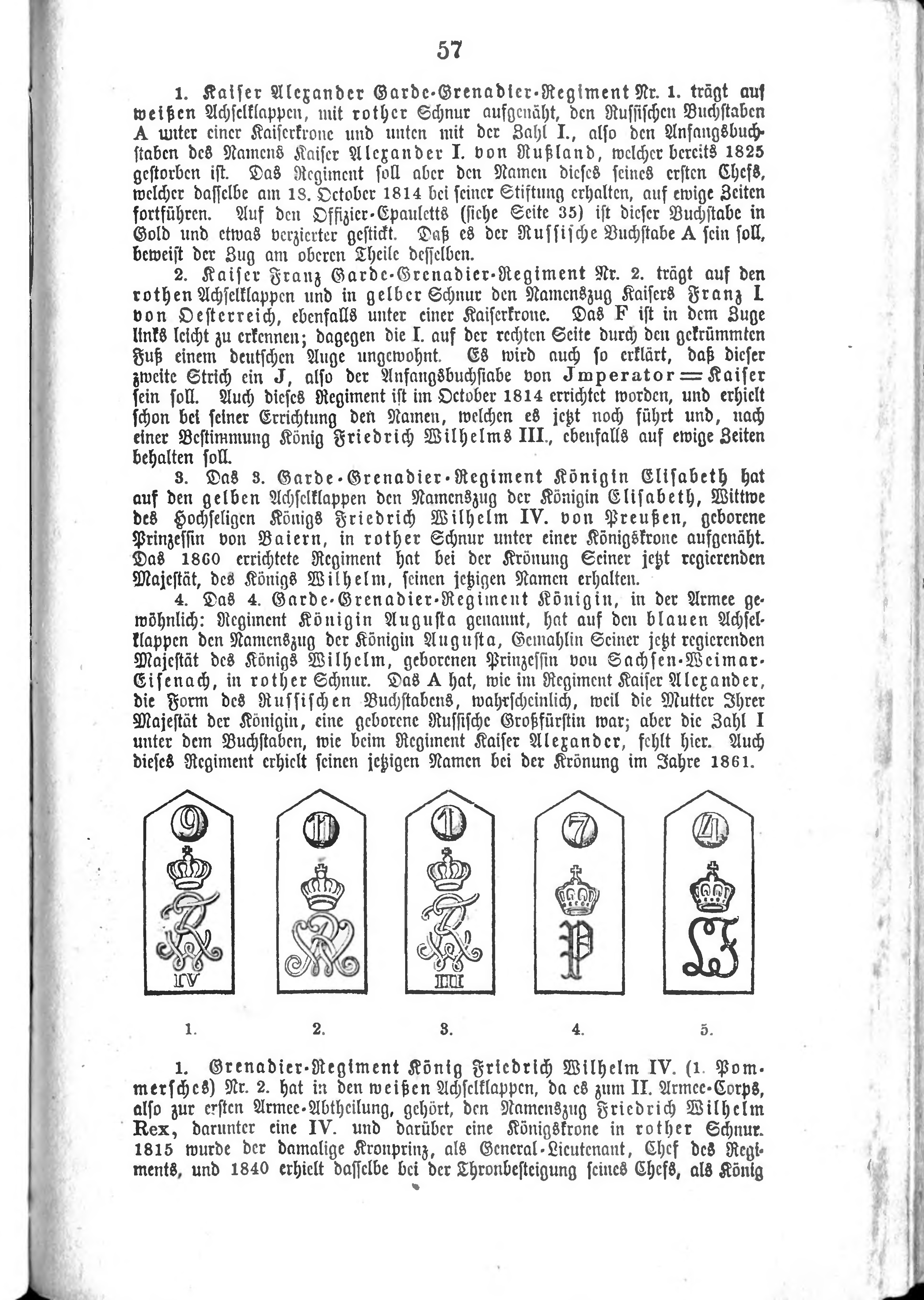 4. Das 4. Garde-Grenadier-Regiment Königin, in der Armee gewöhnlich: Regiment Königin Augusta genannt, hat auf dem blauen Achselklappen den Namenszug der Königin Augusta, Gemahlin Seiner jetzt regierenden Majestät des Königs Wilhelm, geborene Prinzessin voon Sachsen-Weimar-Eisenach, in rother Schnur. Das A hat, wie im Regiment Kaiser Alexander, die Form des Russischen Buchstabens, wahrscheinlich, weil die Mutter Ihrer Majestät der Königin, eine geborene Russische Großfürstin war; aber die Zahl I unter dem Buchstaben, wie beim Regiment Kaiser Alexander, fehlt hier. Auch dieses Regiment erhielt seinen jetzigen Namen bei der Krönung im Jahre 1861.