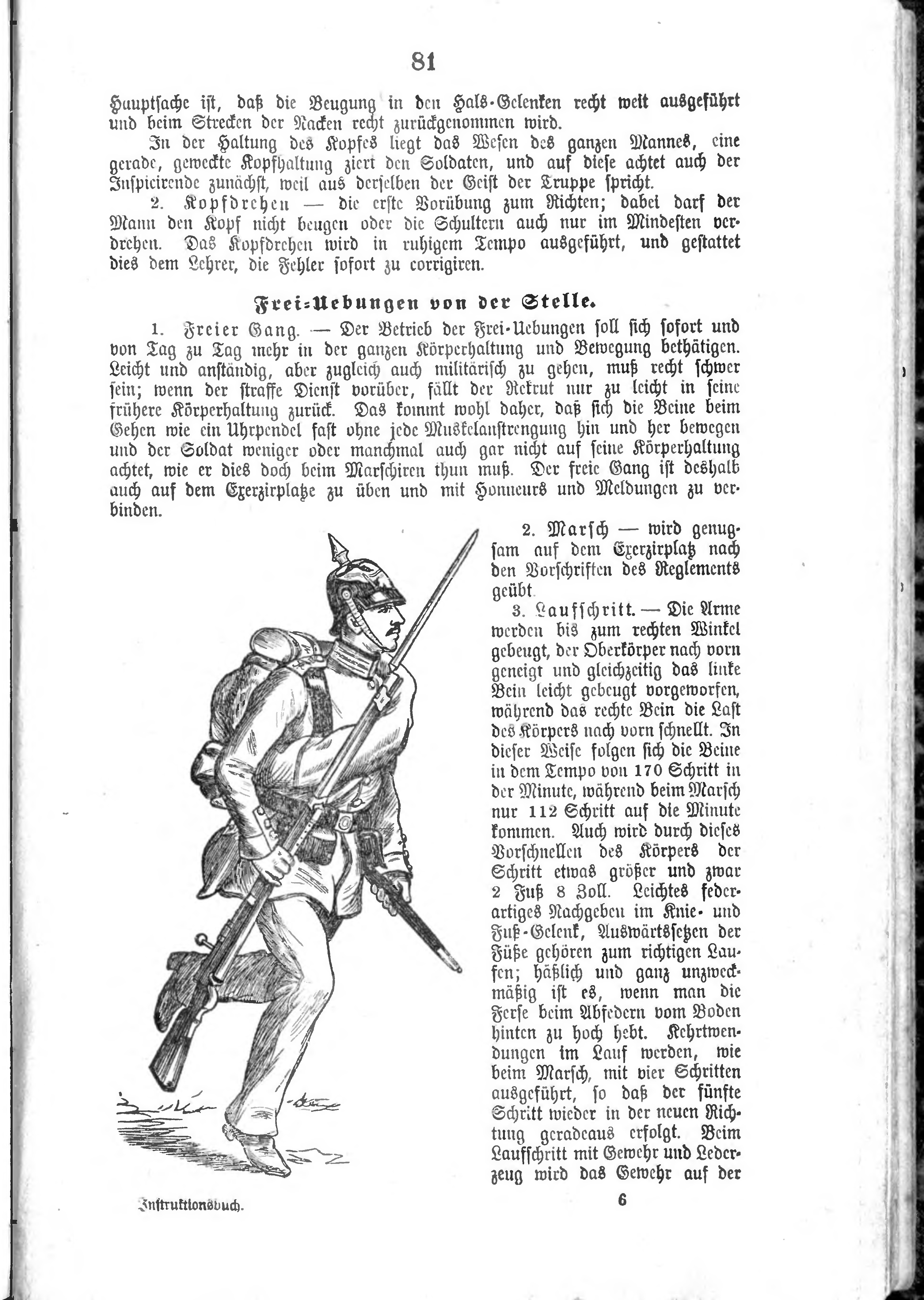 1. Freier Gang - Der Betrieb der Frei-Uebungen soll sich sofort und von Tag zu Tag mehr in der ganzen Körperhaltung und Bewegung bethätigen. Leicht und anständig, aber zugleich auch militärisch gehen, muß recht schwer sein; wenn der straffe Dienst vorüber, fällt der Rekrut nur zu leicht in seine frühere Körperhaltung zurück. Das kommt wohl daher, daß sich die Beine beim Gehen wie ein Uhrpendel fast ohne jede Muskelanstrengung hin und her bewegen und der Soldat weniger oder manchmal auch gar nicht auf seine Körperhaltung achtet. wie er dies doch beim Marschiren thun muß. Der freie Gang ist deshalb auch auf dem Exerzirplatze zu üben und mit Honneurs und Meldungen zu verbinden.