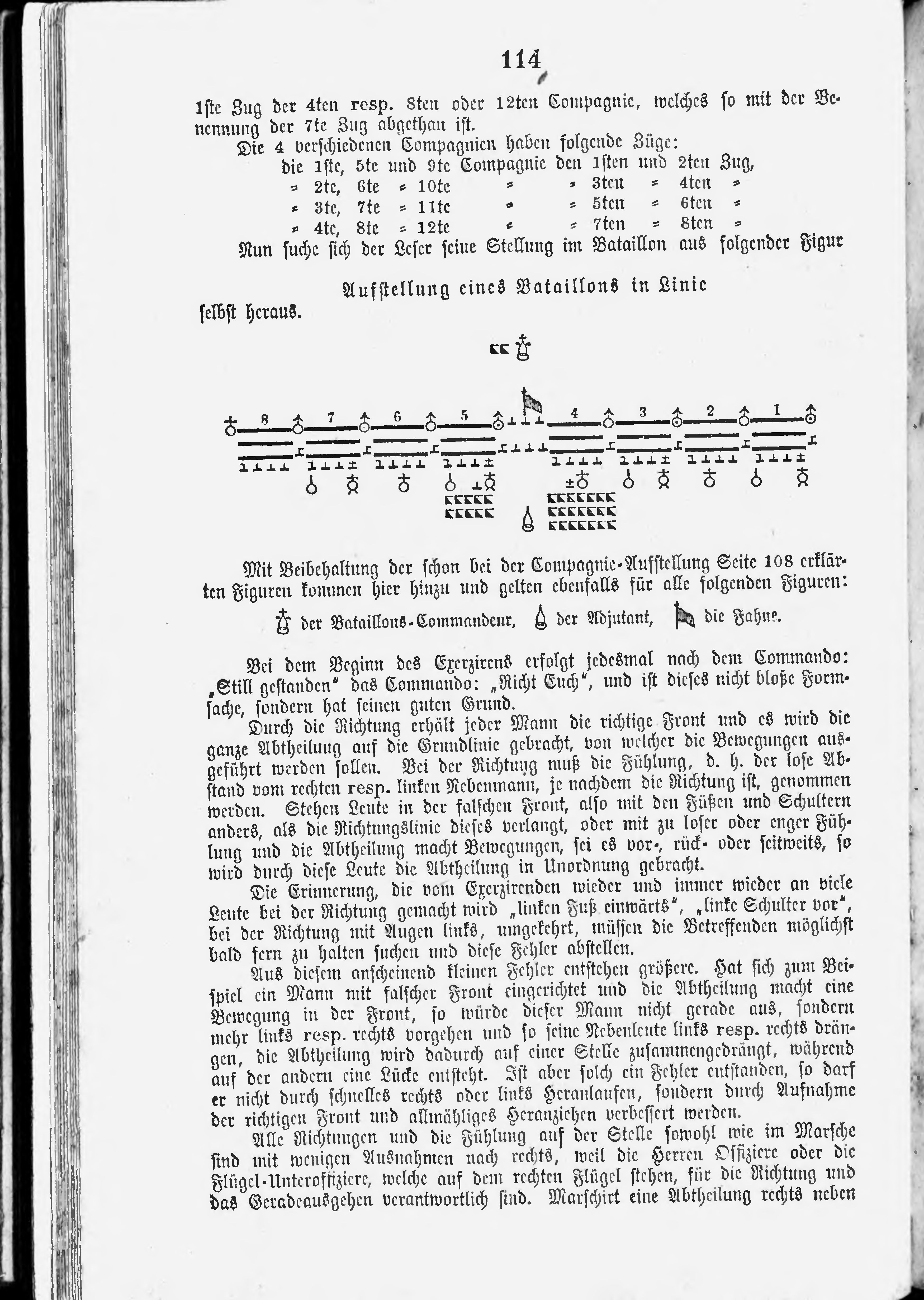 Alle Richtungen und die Fühlung auf der Stelle sowohl wie im Marsche sind mit wenigen Ausnahmen nach rechts, weil die Herren Offiziere oder die Flügel-Unteroffiziere, welche auf dem rechten Flügel stehen, für die Richtung und das Geradeausgehen verantwortlich sind. Marschirt eine Abtheilung rechts neben