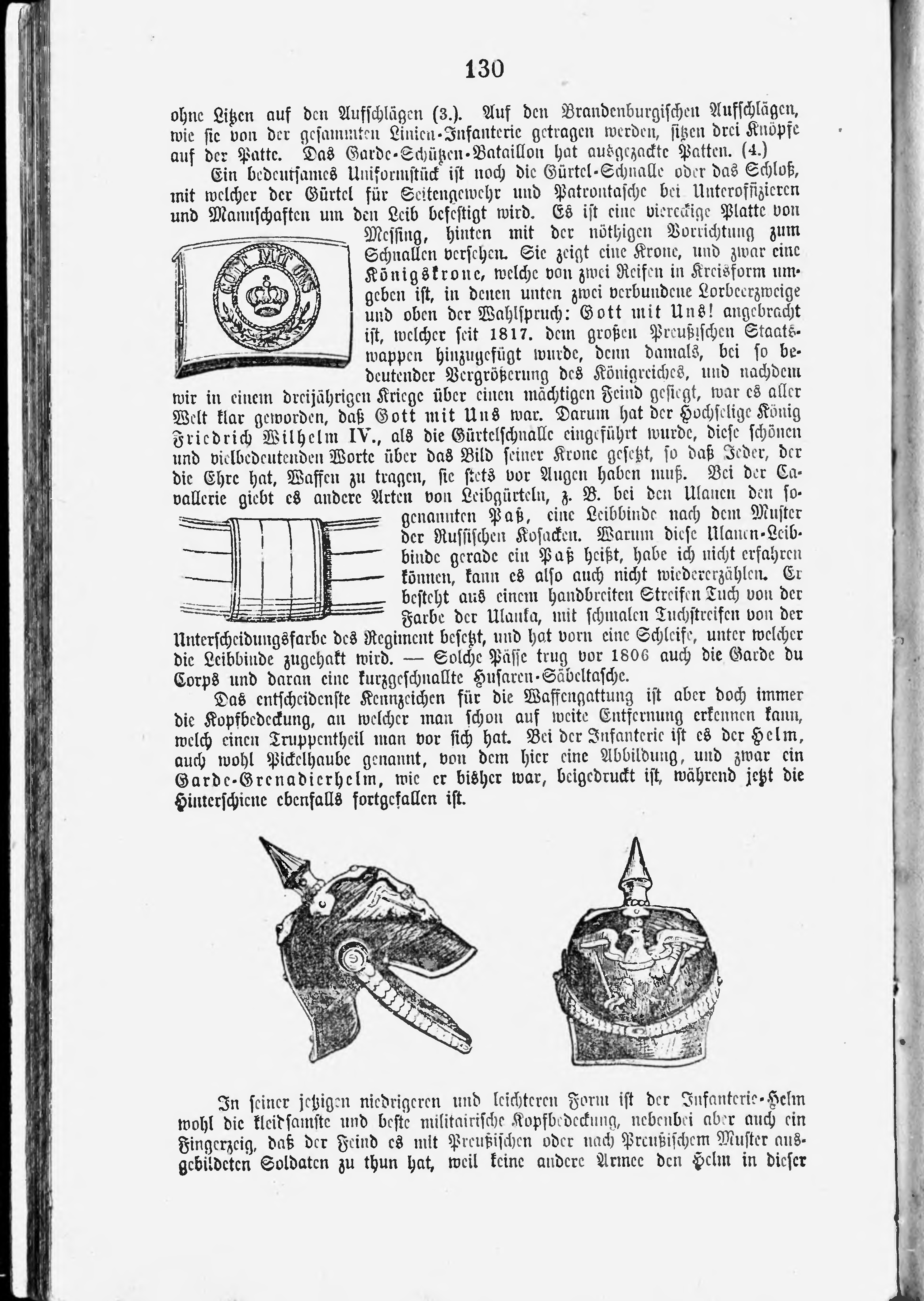 Sie zeigt eine Krone, und zwar eine Königskrone, welche von zwei Reifen in Kreisform umgeben ist, in denen unten zwei verbundene Lorbeerzweige und oben der Wahlspruch: Gott mit uns! angebracht ist, welcher seit 1817 dem großen Preußischen Staatswappen hinzugefügt wurde, denn damals, bei so bedeutender Vergrößerung des Königreiches, und nachdem wir in einem dreijährigen Krieg über einen mächtigen Feind gesiegt, war es aller Welt klar geworden, daß Gott mit uns war. Darum hat der Hochselige König Friedrich Wilhelm IV., als die Gürtelschnalle eingeführt wurde, diese schönen und vielbedeutenden Worte über das Bild seiner Krone gesetzt, so daß Jeder, der die Ehre hat, Waffen zu tragen, sie stets vor Augen haben muß. Bei der Cavallerie giebt es andere Arten von Leibgürteln, z. B. bei den Ulanen den sogenannten Paß, eine Leibbinde nach dem Muster der Russischen Kosacken.