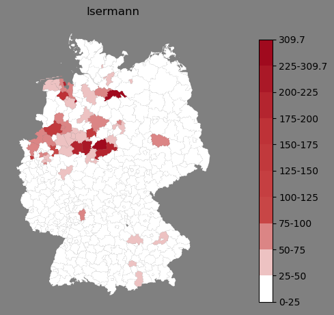 Absolute Verteilung des Namens Isermann (1890)Direkt zur Karte Absolute Verteilung des Namens "Isermann" um 1890 im damaligen Deutschen Reich Sie können die Karte innerhalb des Fensters zoomen und verschieben. |