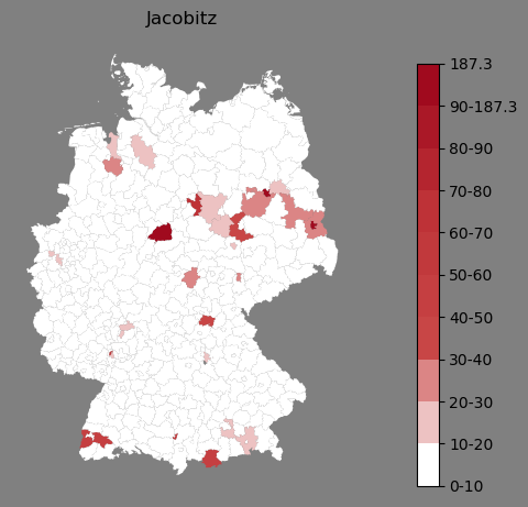 Relative Verteilung des Namens Jacobitz (1996)Direkt zur Karte Die Farbskala zeigt die Anzahl von "Jacobitz" bezogen auf je 1 Million Einträge. |