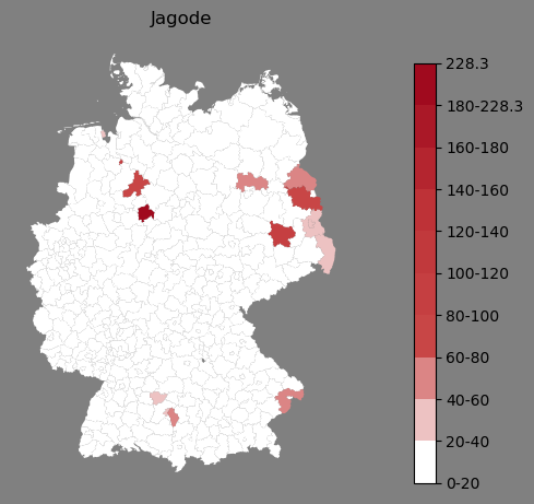 Die Farbskala zeigt die Anzahl von "Jagode" bezogen auf je 1 Million Einträge.