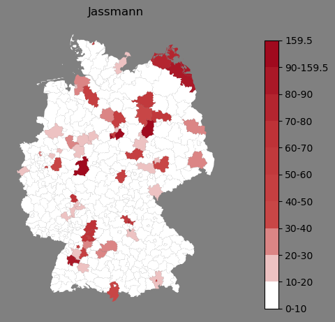 Absolute Verteilung des Namens Jassmann (1890)Direkt zur Karte Absolute Verteilung des Namens "Jassmann" um 1890 im damaligen Deutschen Reich Sie können die Karte innerhalb des Fensters zoomen und verschieben. |