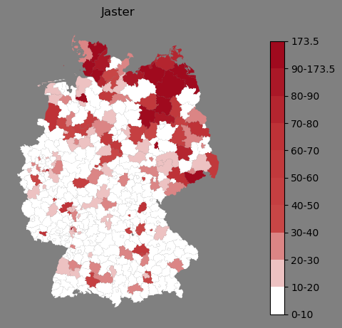 Relative Verteilung des Namens Jaster (1996)Direkt zur Karte Die Farbskala zeigt die Anzahl von "Jaster" bezogen auf je 1 Million Einträge. |