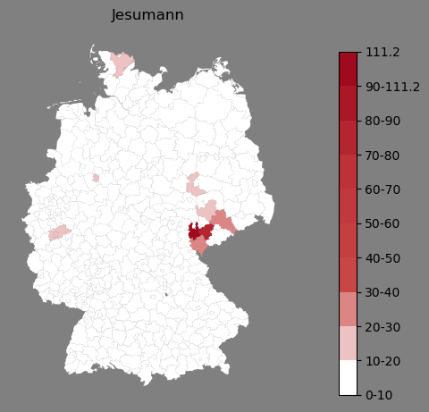 Relative Verteilung des Namens Jesumann (1996)Direkt zur Karte Die Farbskala zeigt die Anzahl von "Jesumann" bezogen auf je 1 Million Einträge. |