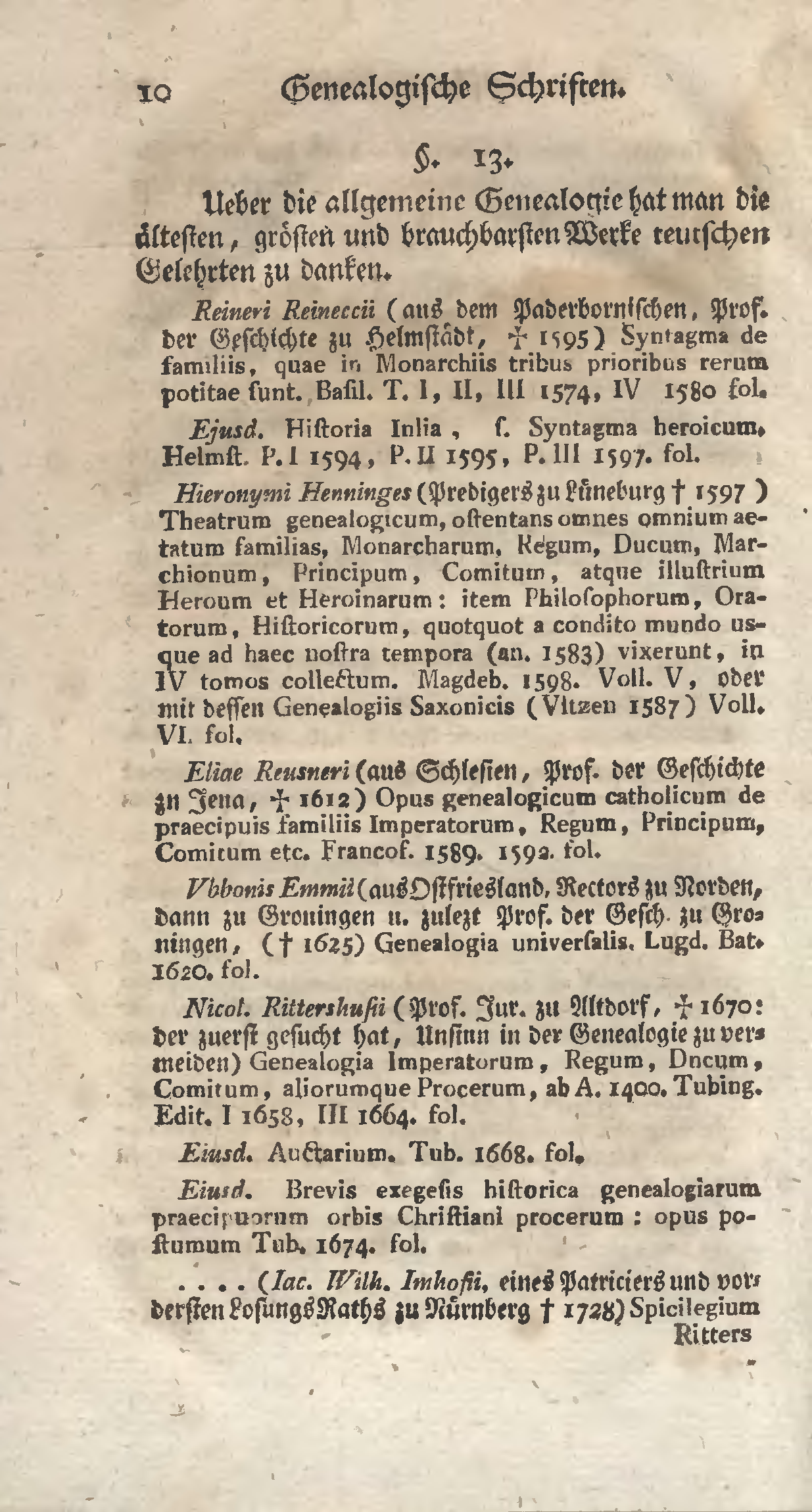 - Nicol. Rittershusii (Prof. Jur. zu Altdorf, † 1670: der zuerst gesucht hat, Unsinn in der Genealogie zu vermeiden) Genealogia Imperatorum, Regum, Ducum, Comitum, aliorumque Procerum, ab A. 1400. Tubing. Edit. I 1658, III 1664. fol.
