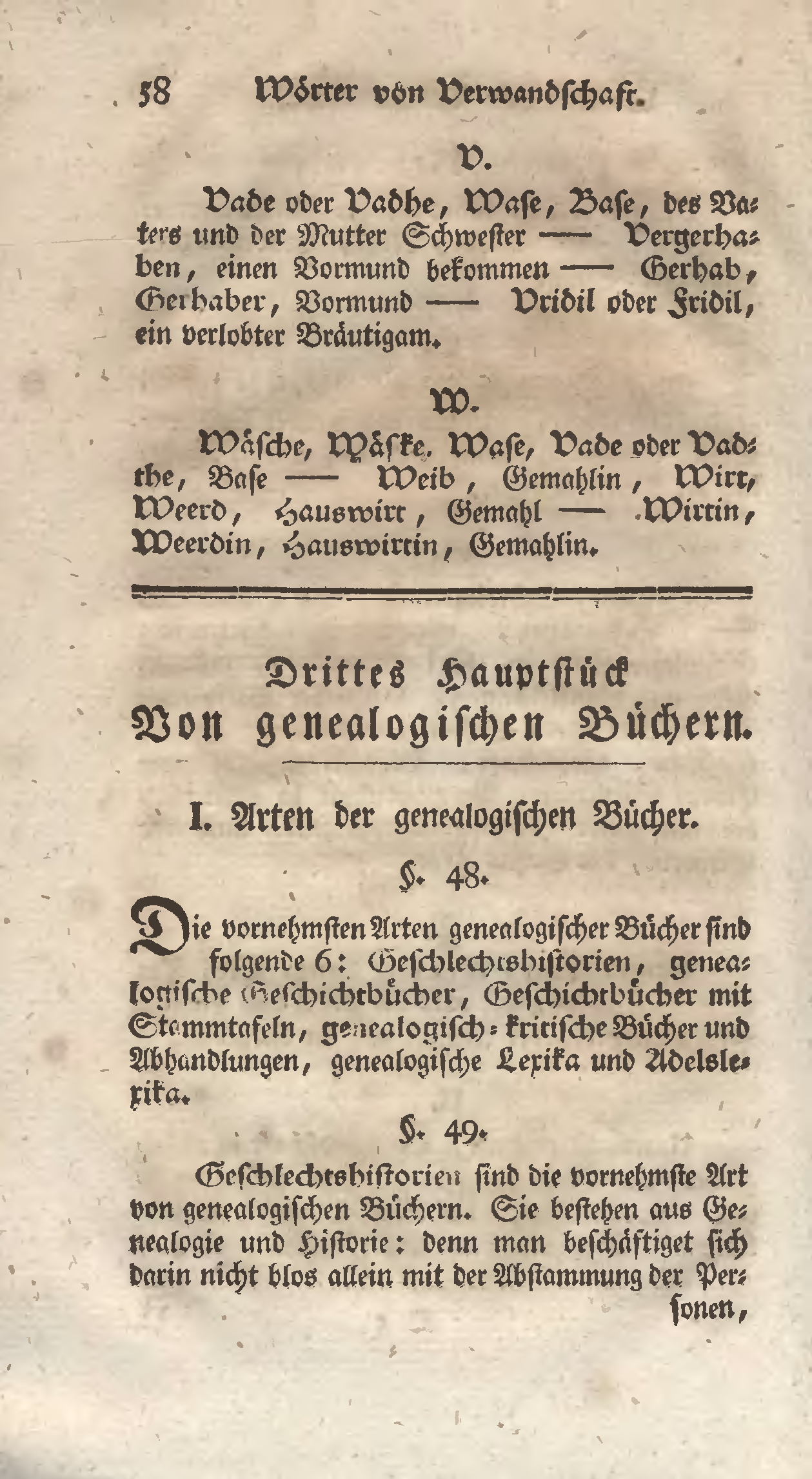 Die vornehmsten Arten genealogischer Bücher sind folgende 6: Geschlechtshistorien, genealogische Geschichtbücher, Geschichtbücher mit Stammtafeln, genealogisch-kritische Bücher und Abhandlungen, genealogische Lexika und Adelslexika.