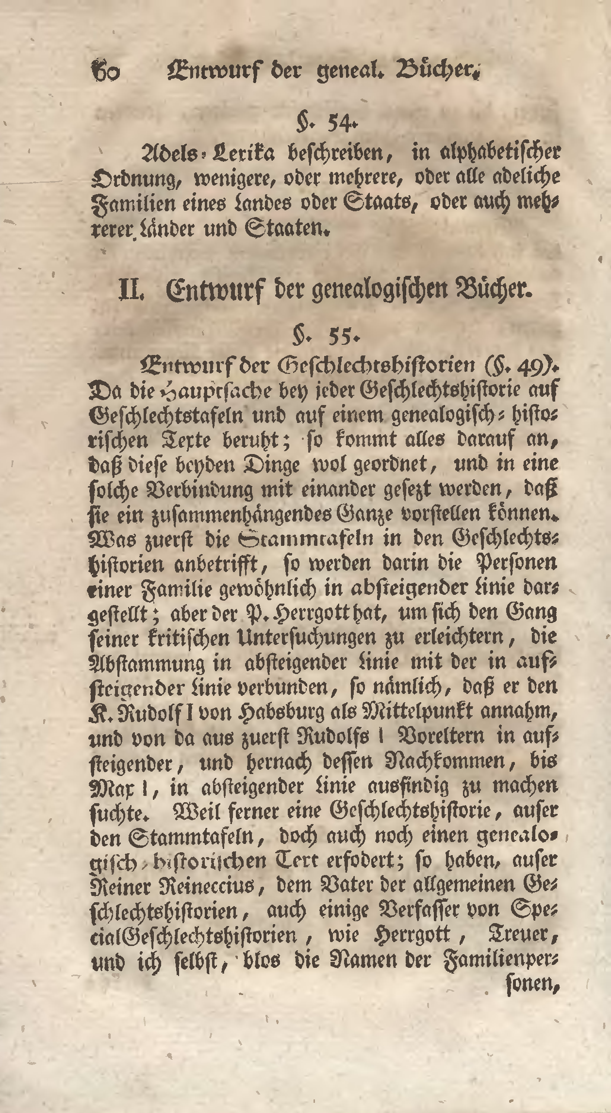 Entwurf der Geschlechtshistorien (§. 49). Da die Hauptsache bey jeder Geschlechtshistorie auf Geschlechtstafeln und auf einem genealogisch-historischen Texte beruht; so kommt alles darauf an, daß diese beyden Dinge wol geordnet, und in eine solche Verbindung mit einander gesezt werden, daß sie ein zusammenhängendes Ganze vorstellen können. Was zuerst die Stammtafeln in den Geschlechtshistorien anbetrifft, so werden darin die Personen einer Familie gewöhnlich in absteigender Linie dargestellt; aber der P. Herrgott hat, um sich den Gang seiner kritischen Untersuchungen zu erleichtern, die Abstammung in absteigender Linie mit der in aufsteigender Linie verbunden, so nämlich, daß er den K. Rudolf I von Habsburg als Mittelpunkt annahm, und von da aus zuerst Rudolfs I Voreltern in aufsteigender, und hernach dessen Nachkommen, bis Max I, in absteigender Linie ausfindig zu machen suchte. Weil ferner eine Geschlechtshistorie, auser den Stammtafeln, doch auch noch einen genealogisch-historischen Text erfodert; so haben, auser Reiner Reineccius, dem Vater der allgemeinen Geschlechtshistorien, auch einige Verfasser von SpecialGeschlechtshistorien, wie Herrgott, Treuer, und ich selbst, blos die Namen der Familienpersonen,