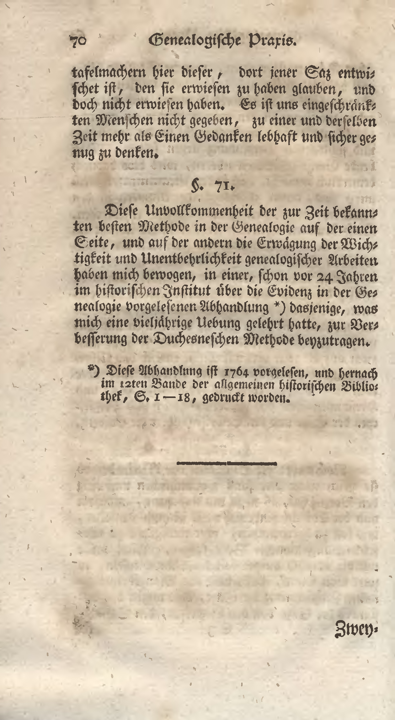 Diese Unvollkommenheit der zur Zeit bekannten besten Methode in der Genealogie auf der einen Seite, und auf der andern die Erwägung der Wichtigkeit und Unentbehrlichkeit genealogischer Arbeiten haben mich bewogen, in einer, schon vor 24 Jahren im historischen Institut über die Evidenz in der Genealogie vorgelesenen Abhandlung[1] dasjenige, was mich eine vieljährige Übung gelehrt hatte, zur Verbesserung der Duchesneschen Methode beyzutragen.