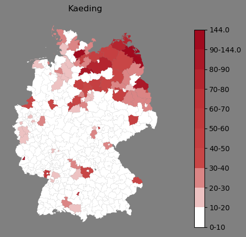 Relative Verteilung des Namens Kaeding (1996)Direkt zur Karte Die Farbskala zeigt die Anzahl von "Kaeding" bezogen auf je 1 Million Einträge. |