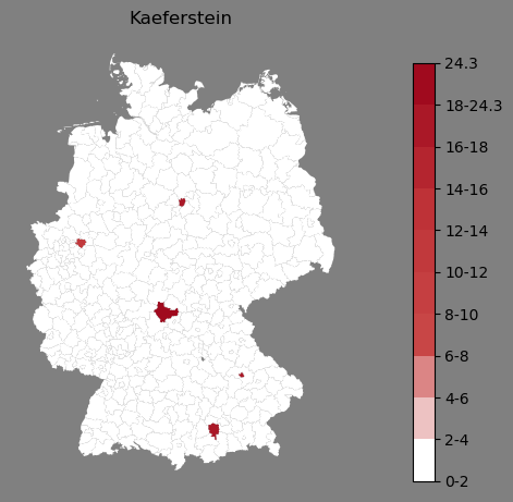Relative Verteilung des Namens Kaeferstein (1996)Direkt zur Karte Die Farbskala zeigt die Anzahl von "Kaeferstein" bezogen auf je 1 Million Einträge. |