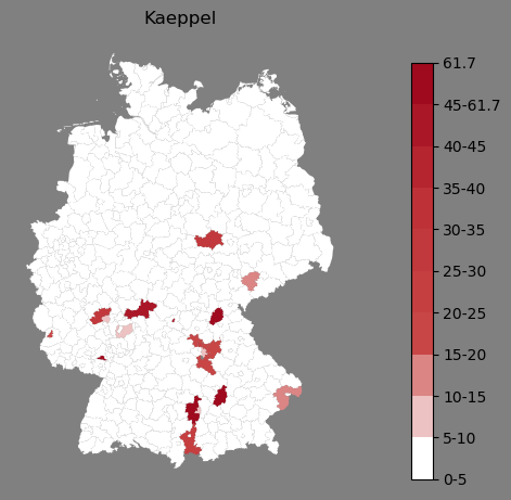 Relative Verteilung des Namens Kaeppel (1996)Direkt zur Karte Die Farbskala zeigt die Anzahl von "Kaeppel" bezogen auf je 1 Million Einträge. |