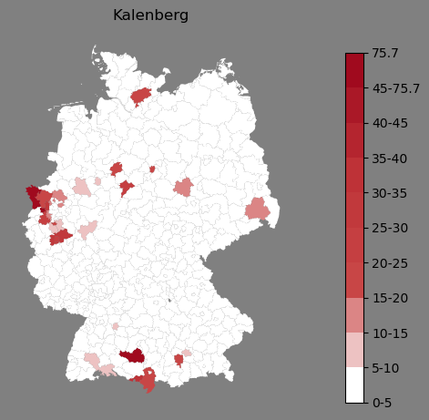 Relative Verteilung des Namens Kalenberg (1996)Direkt zur Karte Die Farbskala zeigt die Anzahl von "Kalenberg" bezogen auf je 1 Million Einträge. |