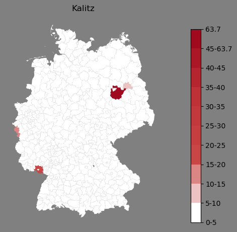 Relative Verteilung des Namens Kalitz (1996)Direkt zur Karte Die Farbskala zeigt die Anzahl von "Kalitz" bezogen auf je 1 Million Einträge. |