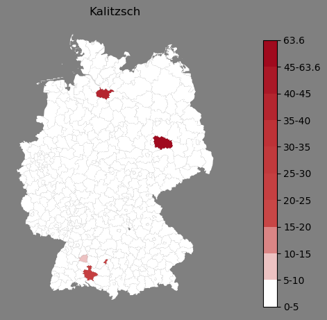 Relative Verteilung des Namens Kalitzsch (1996)Direkt zur Karte Die Farbskala zeigt die Anzahl von "Kalitzsch" bezogen auf je 1 Million Einträge. |