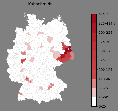 Relative Verteilung des Namens Kaltschmidt (1996)Direkt zur Karte Die Farbskala zeigt die Anzahl von "Kaltschmidt" bezogen auf je 1 Million Einträge. |