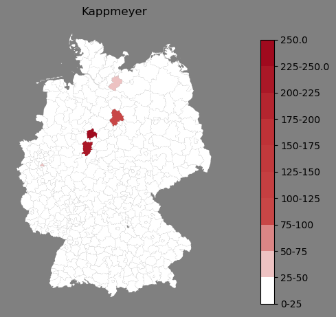 Relative Verteilung des Namens Kappmeyer (1996)Direkt zur Karte Die Farbskala zeigt die Anzahl von "Kappmeyer" bezogen auf je 1 Million Einträge. |