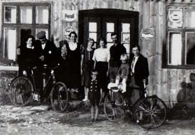 Die Bilder zeigen die Familien von Christoph Kruwinnus und seiner Ehefrau Helene geb. Luttkus in Karwohlen vor ihrem Kolonialwarenladen. Bei ihnen sind ihre Kinder.