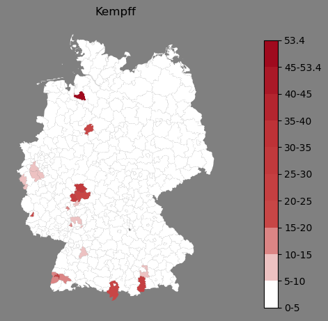 Relative Verteilung des Namens Kempff (1996)Direkt zur Karte Die Farbskala zeigt die Anzahl von "Kempff" bezogen auf je 1 Million Einträge. |
