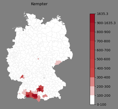 Absolute Verteilung des Namens Kempter (1890)Direkt zur Karte Absolute Verteilung des Namens "Kempter" um 1890 im damaligen Deutschen Reich Sie können die Karte innerhalb des Fensters zoomen und verschieben. |