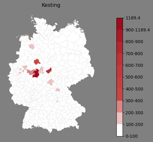 Relative Verteilung des Namens Kesting (1996)Direkt zur Karte Die Farbskala zeigt die Anzahl von "Kesting" bezogen auf je 1 Million Einträge. |